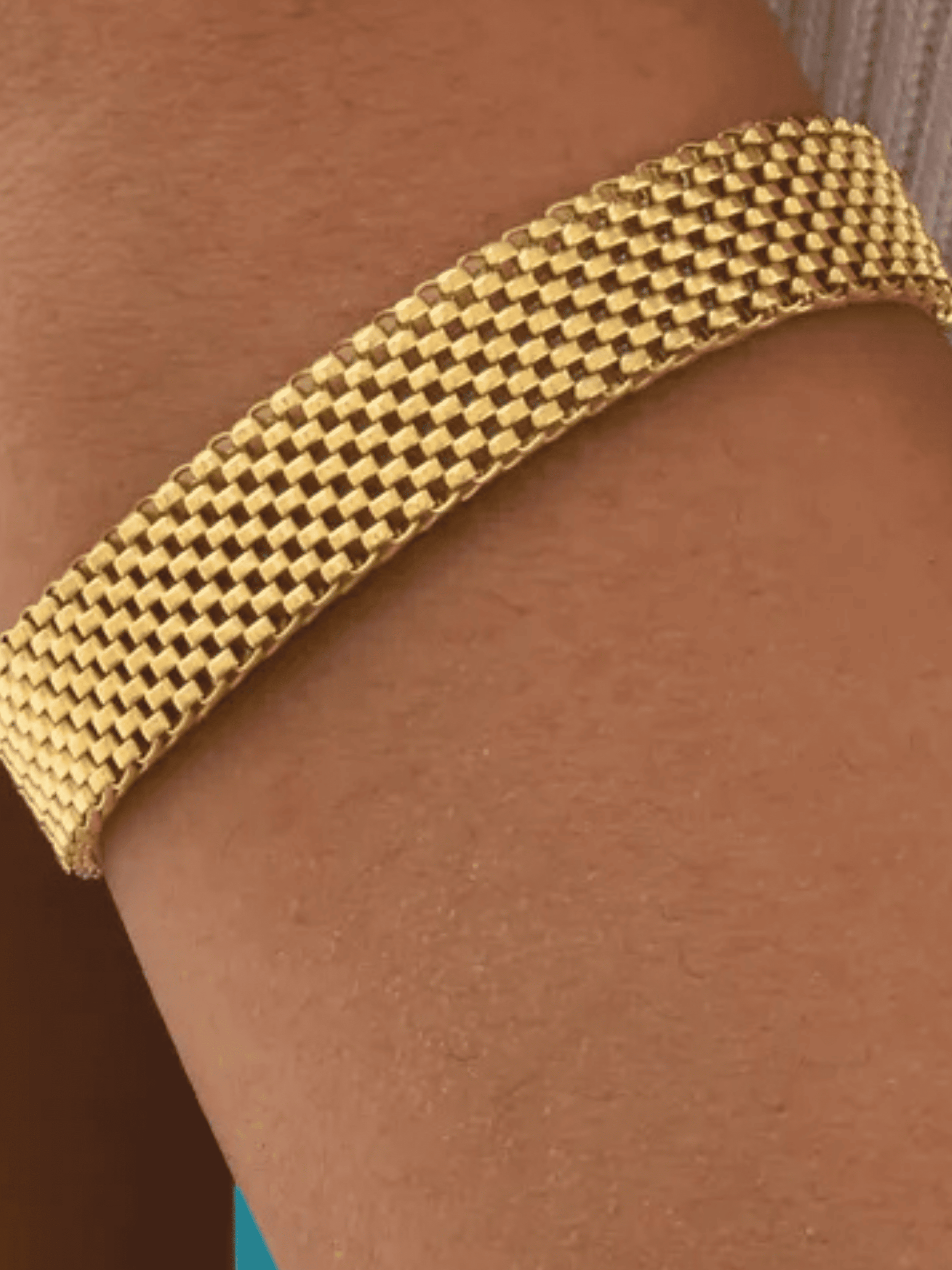 Poder y elegancia 💛. La Pulsera Diosa tiene un acabado dorado con textura metálica que resalta en cualquier outfit.